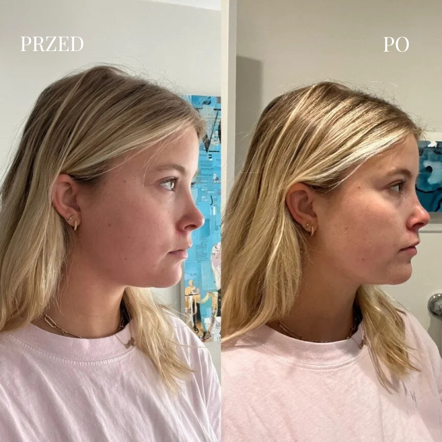 Działa dokładnie tam, gdzie tego potrzebujesz, podkreśla linię żuchwy i optycznie poprawia owal twarzy. Skóra wygląda na bardziej napiętą, a kontur twarzy staje się wyraźniejszy i harmonijny.